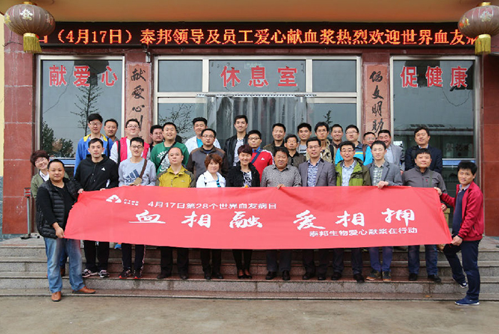 2016年4月16-17日,為迎接第28個(gè)世界血友病日的到來(lái),山東泰邦生物制品有限公司組織員工五十余人到寧陽(yáng)漿站舉行了捐獻(xiàn)血漿公益活動(dòng)?;顒?dòng)以血相融 愛(ài)相擁為主題,旨在以泰邦人的實(shí)際行動(dòng)號(hào)召更多的愛(ài)心人士加入到獻(xiàn)漿隊(duì)伍,提高公眾對(duì)于血友病(凝血功能障礙遺傳性疾?。┑年P(guān)注度,喚起全社會(huì)對(duì)于血友病患者的關(guān)愛(ài)和支持。...